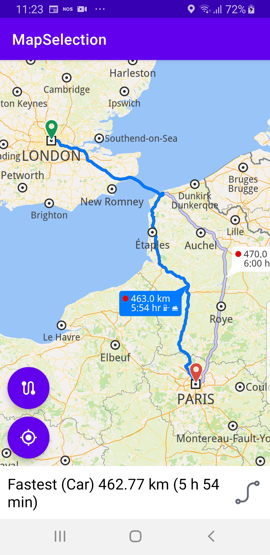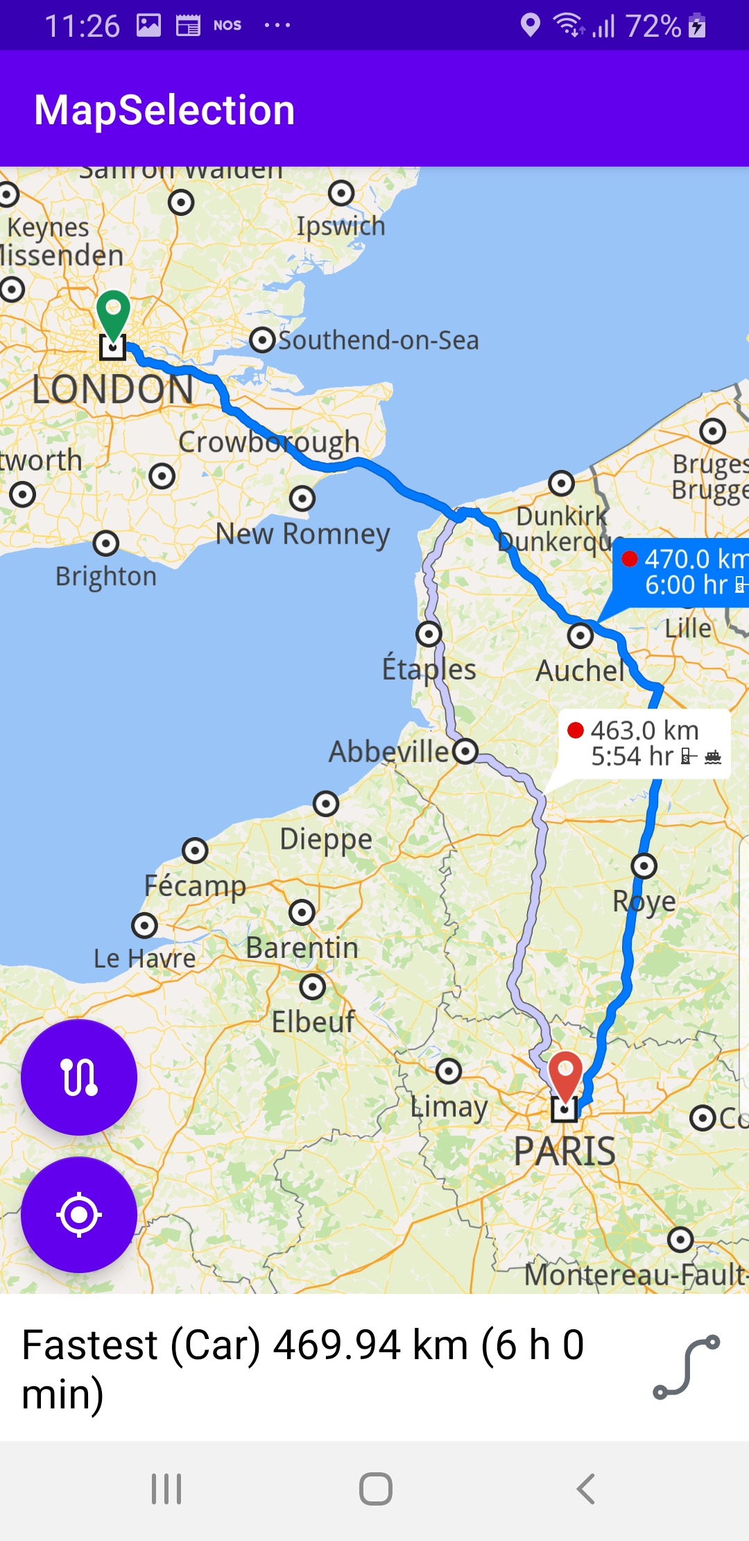 In this example, the route departure point is London, and the destination is Paris, as specified by the Coordinates