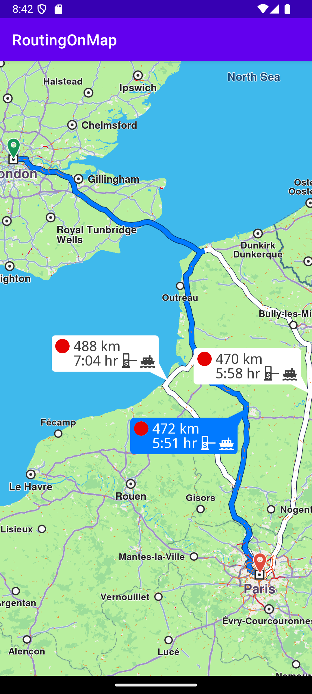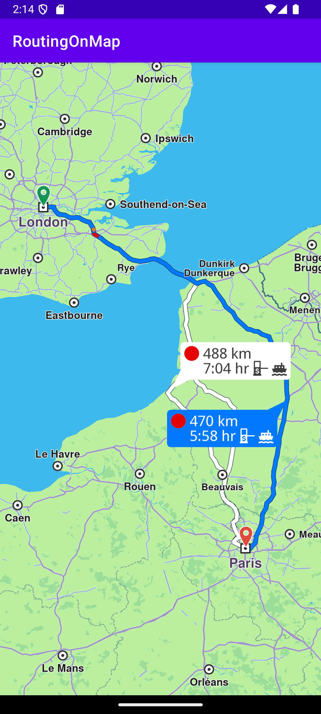 In this example, the route departure point is London, and the destination is Paris, as specified by the Coordinates
