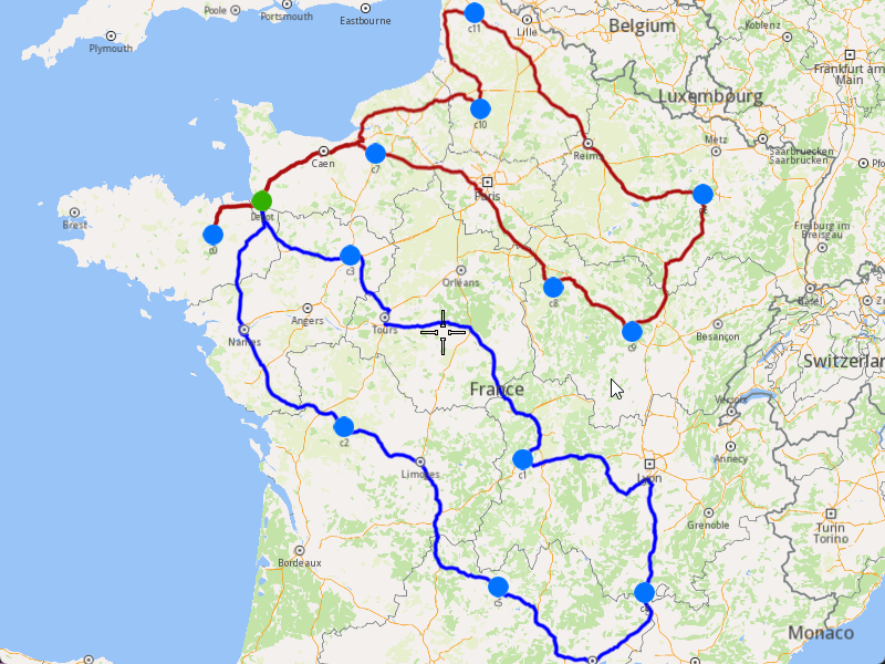 Once the optimization is complete and a solution has been found, we can display the solution on the map: