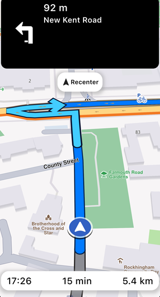 To enhance navigation clarity, the route is displayed on a map. This also includes turn-by-turn navigation arrows that disappear once the user has passed them. More about presenting routes here.