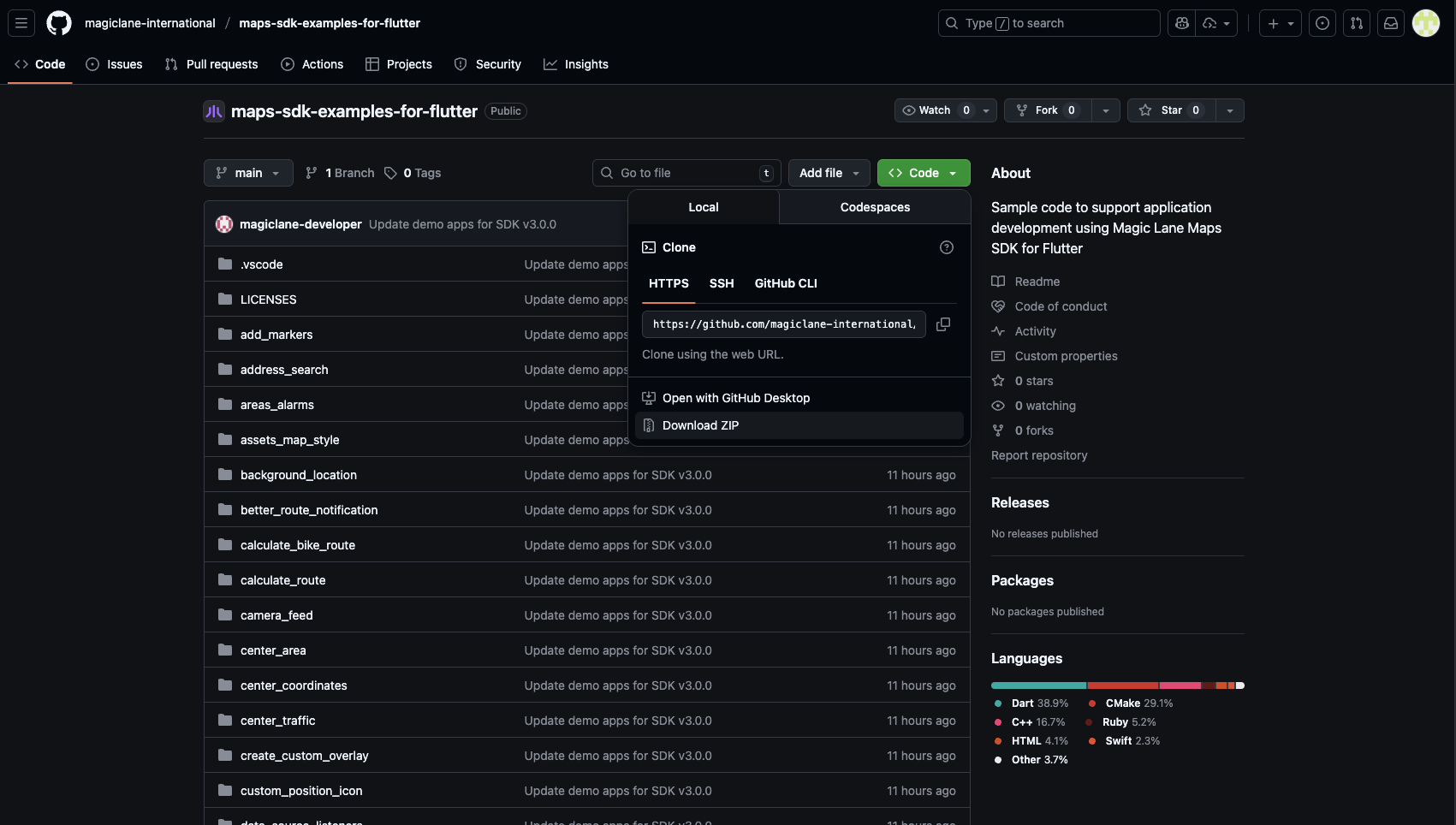 Example applications for the Maps SDK for Flutter are available on Github. You can clone the repository or download project ZIP file by clicking the blue Code