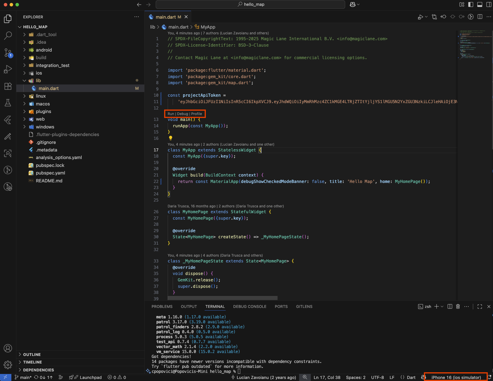 After fetching the dependencies, the errors should disappear, and you can run the example application by tapping F5 or by clicking the run button above the main function. You can run the application on an emulator or a physical device connected to your development machine. Make sure the device is set up for development, recognized by your IDE and selected as the target device.