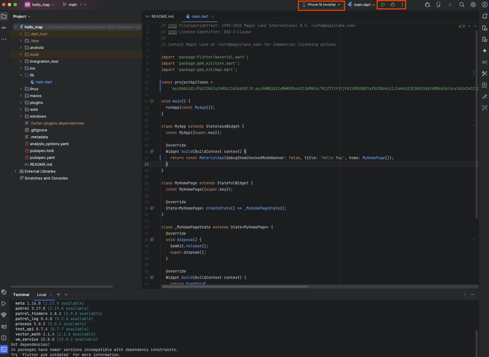 After fetching the dependencies, the errors should disappear, and you can run the example application by clicking the run or debug button on top of the editor. You can run the application on an emulator or a physical device connected to your development machine. Make sure the device is set up for development, recognized by your IDE and selected as the target device.