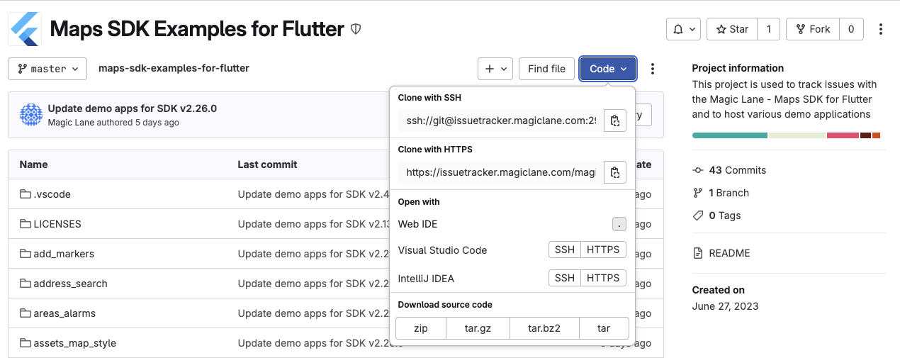 Example applications for the Maps SDK for Flutter are available on IssueTracker. You can clone the repository or download project ZIP file by clicking the blue Code