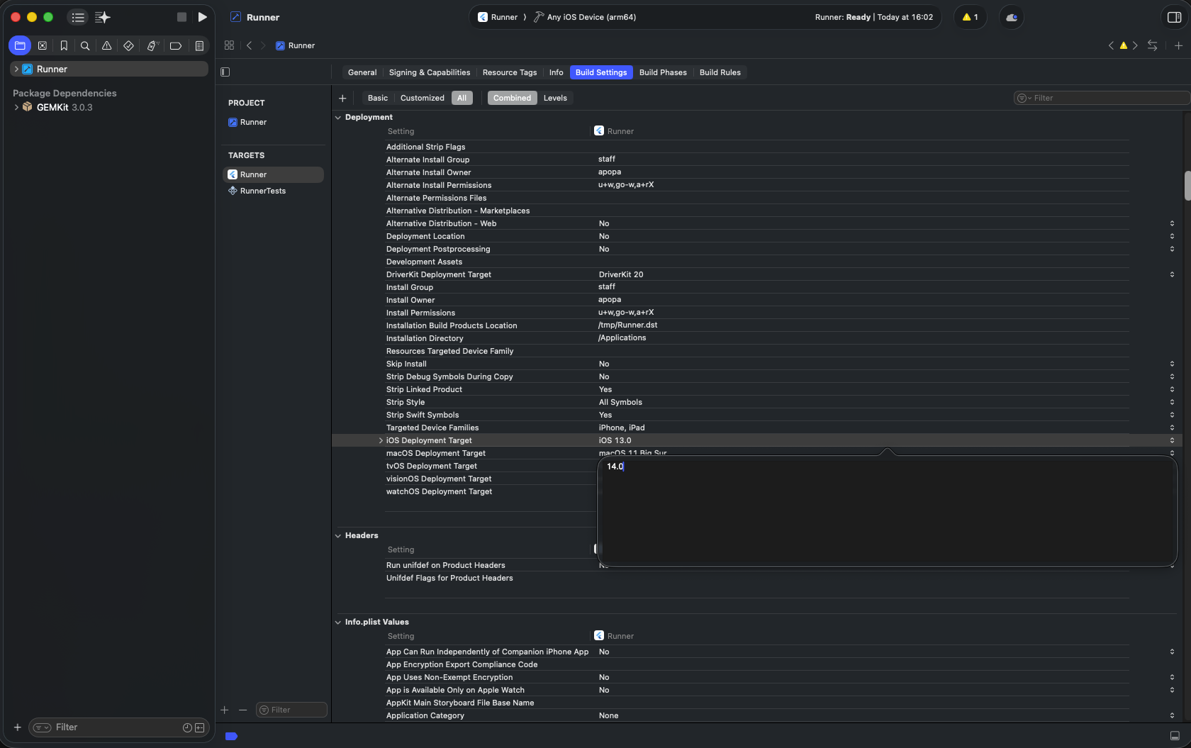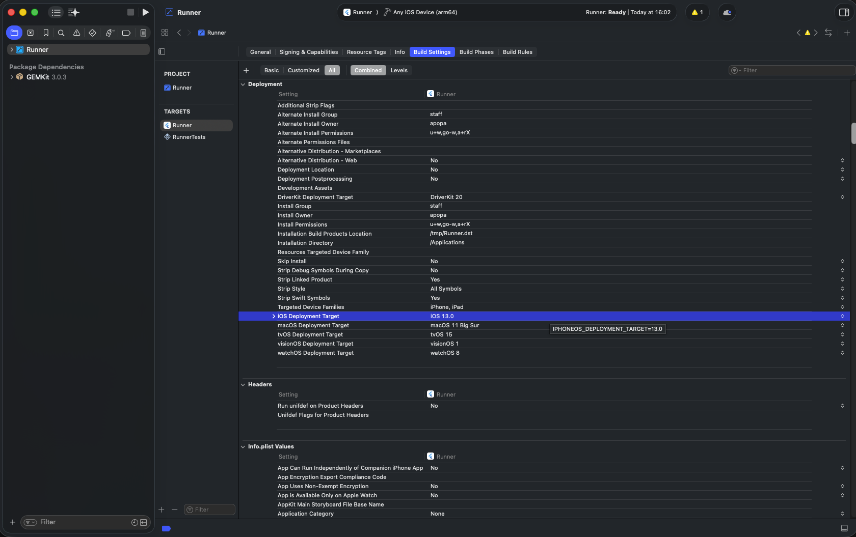 Select the project Runner in the project navigator, then select the target Runner and go to the Build Settings tab and search for iOS Deployment Target under Deployment.